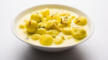 Paneer discs soaked in sweet, creamy saffron milk with nuts.