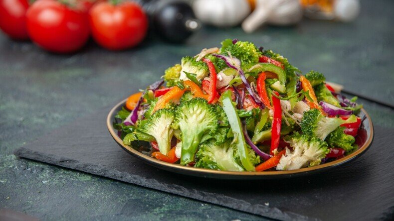 Finely chopped onions, cucumbers, tomatoes, and green chilies with lemon and salt.
