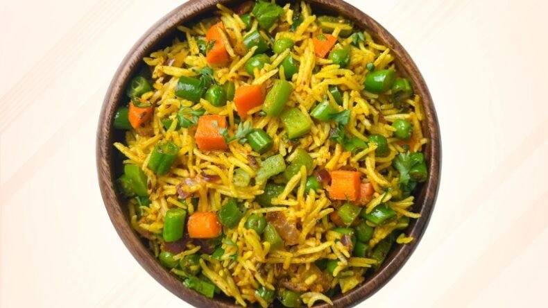 Flavored rice with assorted vegetables and whole spices, perfect with raita.